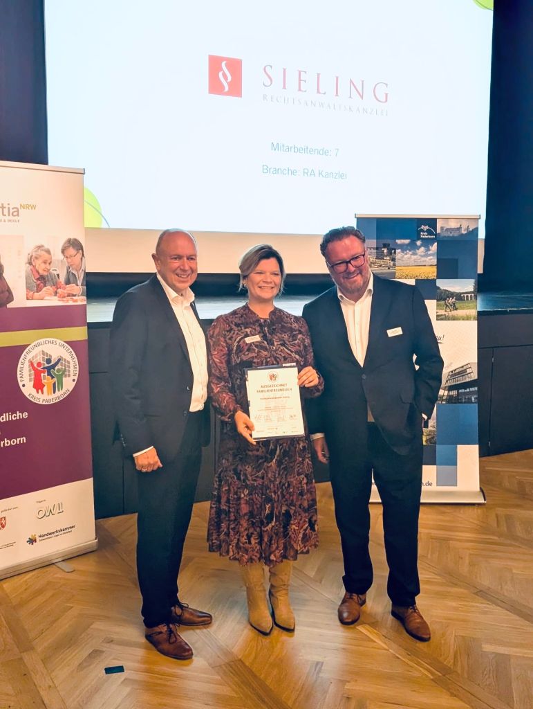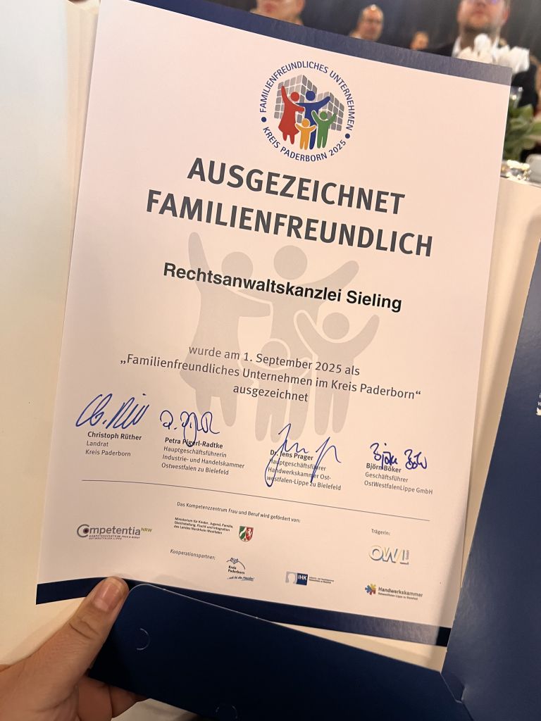 Wir freuen uns sehr, verkünden zu dürfen: Die Kanzlei Sieling wurde erneut als „Familienfreundliches Unternehmen 2025“ im Kreis Paderborn ausgezeichnet! Seit 2023 trägt Kanzlei Sieling stolz das Siegel „Familienfreundliches Unternehmen im Kreis Paderborn“– und auch in diesem Jahr wurden wir vom Kreis Paderborn erneut ausgezeichnet! Diese Ehrung macht uns besonders stolz – denn sie bestätigt, dass unsere Werte und das Miteinander im Team auch nach außen sichtbar werden.